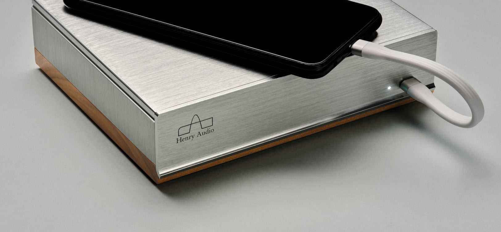 - Compact brushed aluminum case with wooden details