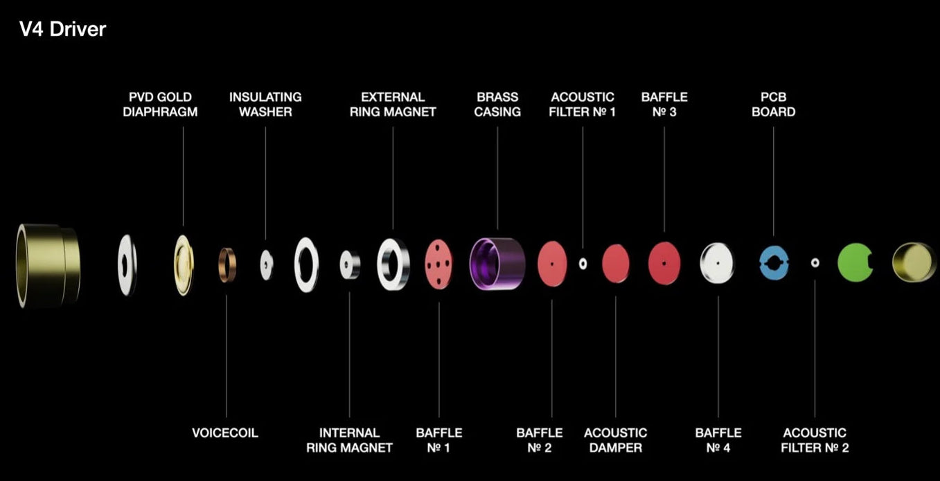 The ten-piece multilayer sandwich construction is precision milled using CNC from Titanium with a unique venting system that together with the V4 driver contributes to the large and spacious soundscape.