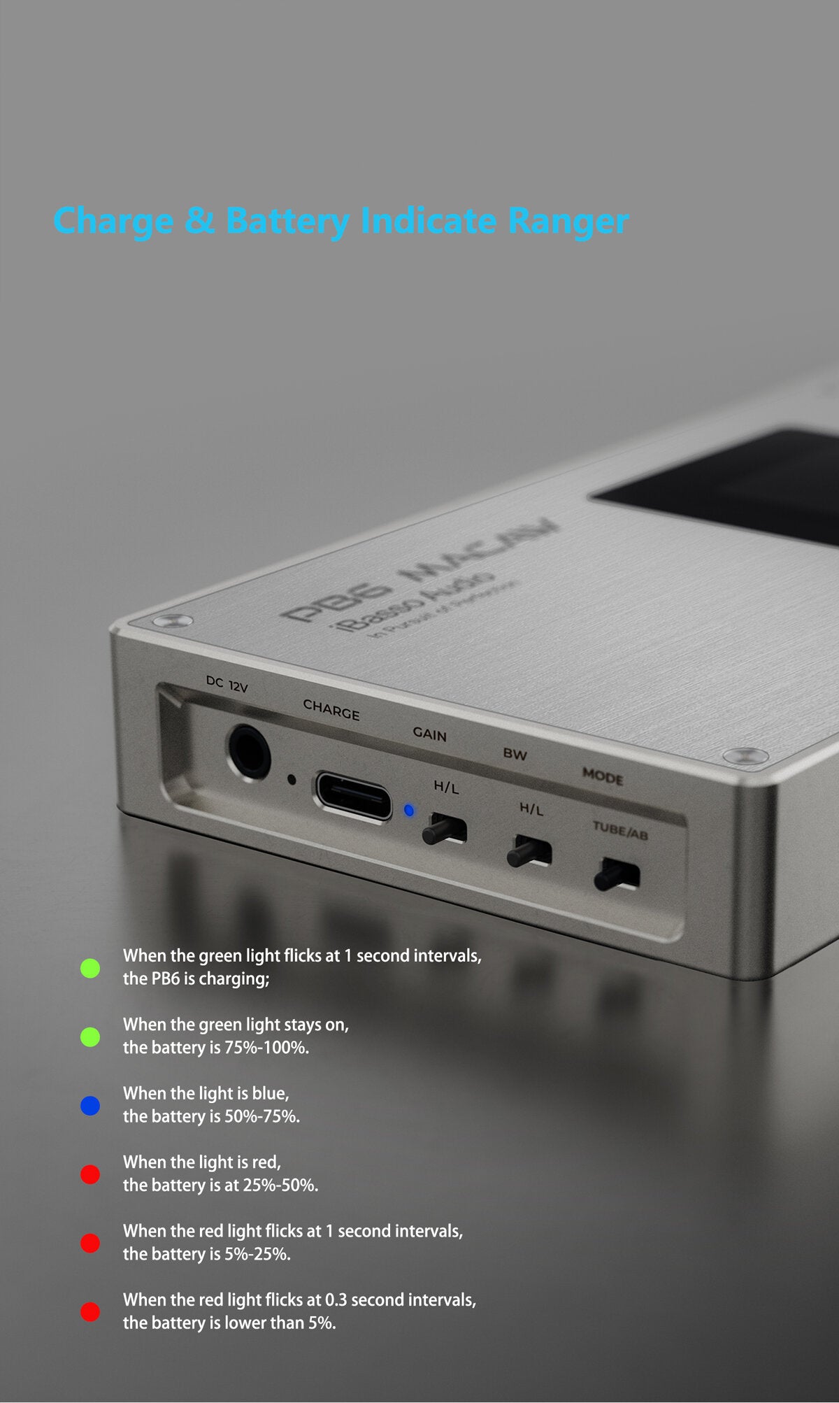 Green blinking (1s): Charging | Green solid: 75%–100% | Blue solid: 50%–75% | Red solid: 25%–50% | Red blinking (1s): 5%–25% | Red blinking (0.3s): Below 5%
