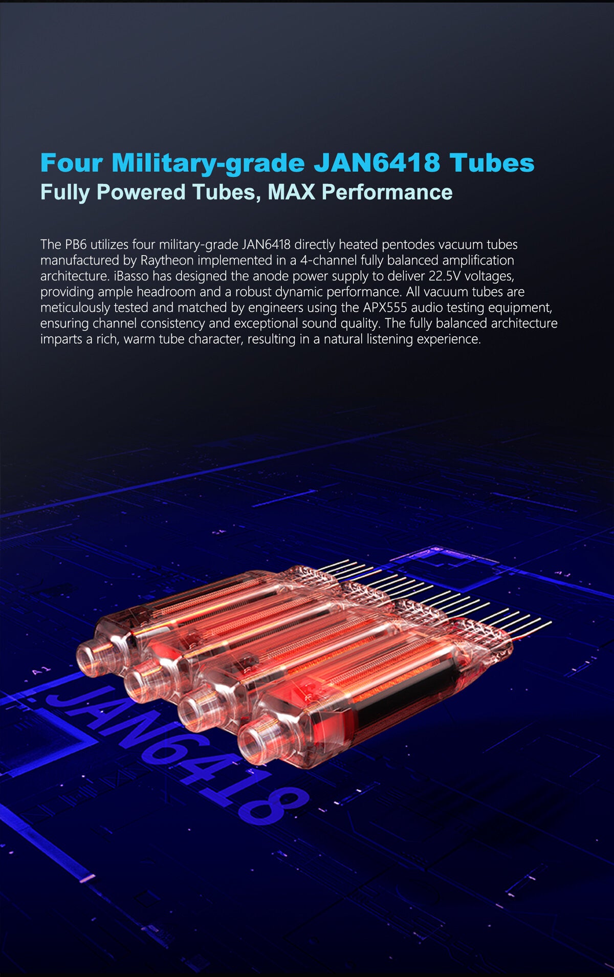 • Powered by four Military-Grade JAN6418 Tubes