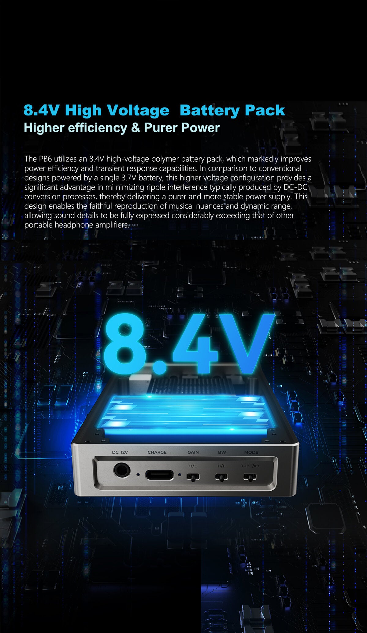 Gain: +8/+14 dB | Freq: 15Hz–80kHz (-0.5 dB) | Dynamic Range: 116 dB | Crosstalk: 100 dB | Max Output: 8.5 Vrms (Battery)