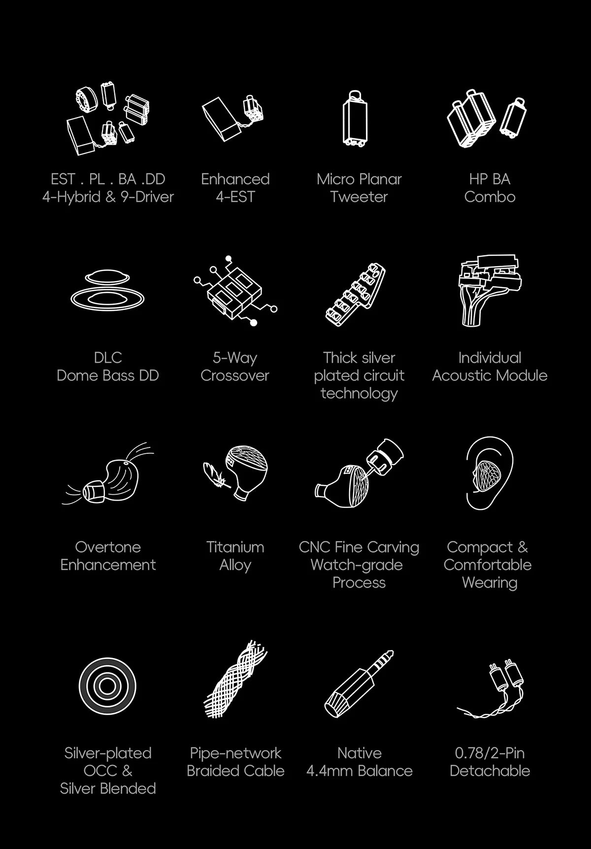 - Nine-driver hybrid with four-way hybrid and five-way crossover design