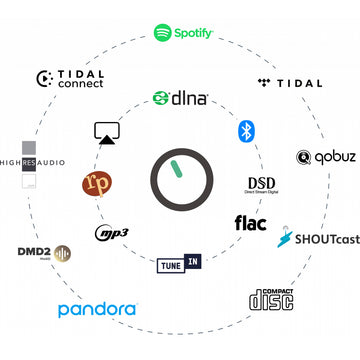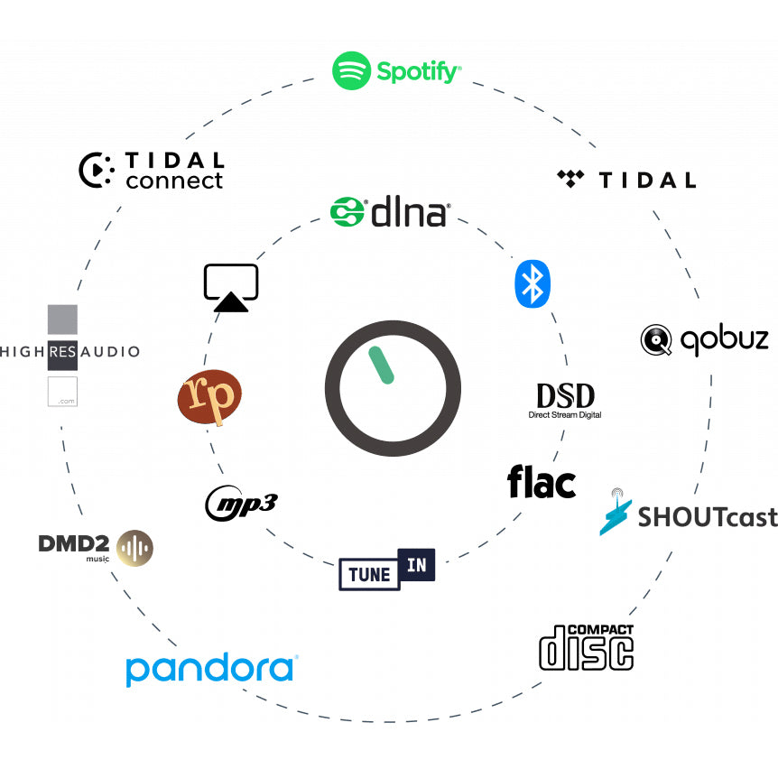 • Volumio, MyVolumio, Roon Ready, Qobuz, TIDAL, Spotify, Highresaudio