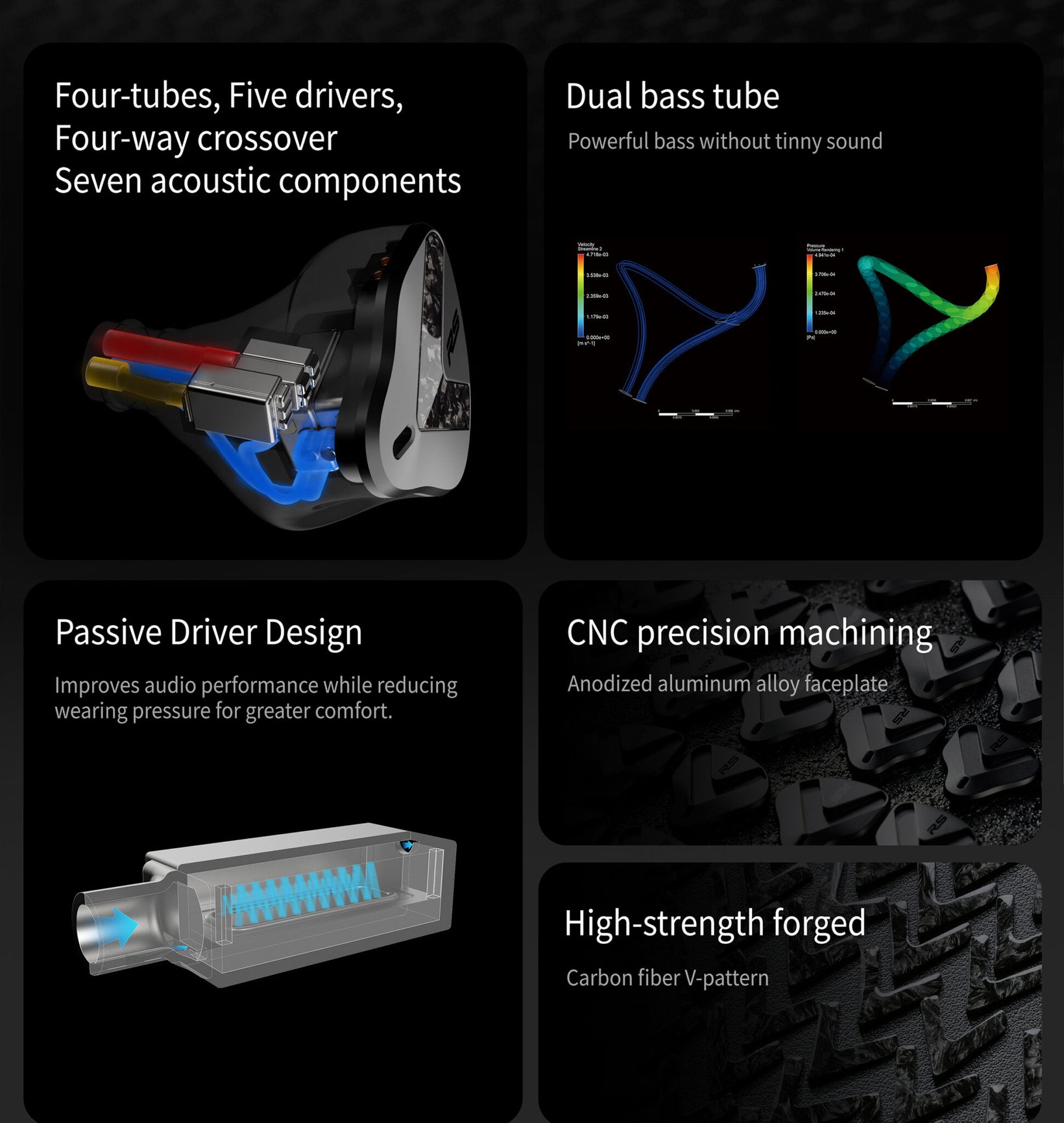 - Four-Tube, Five-Driver, Four-Way Crossover